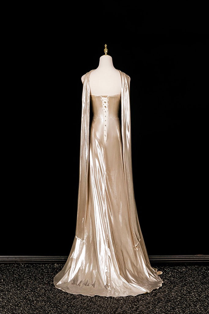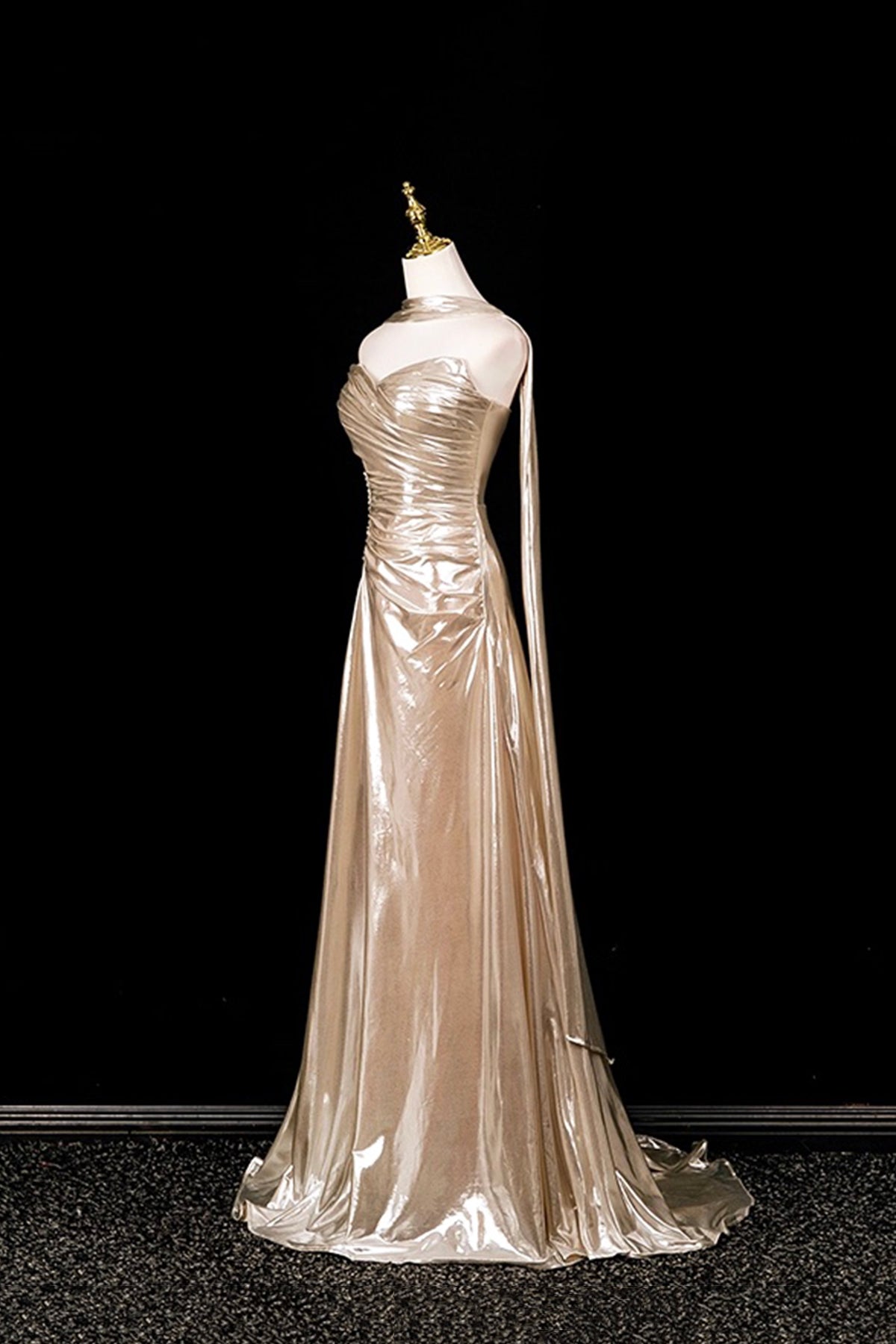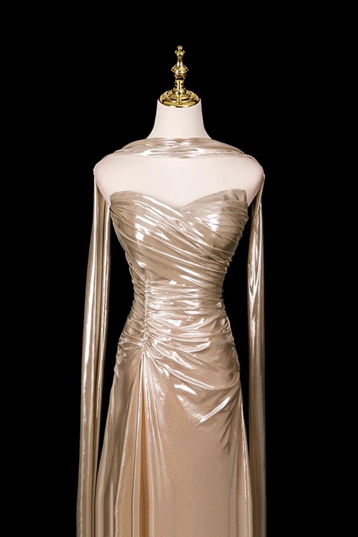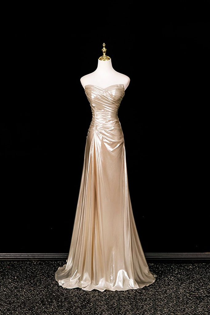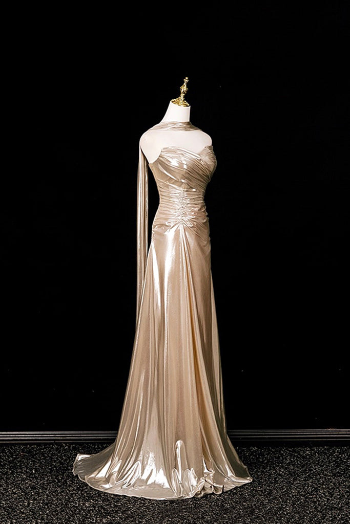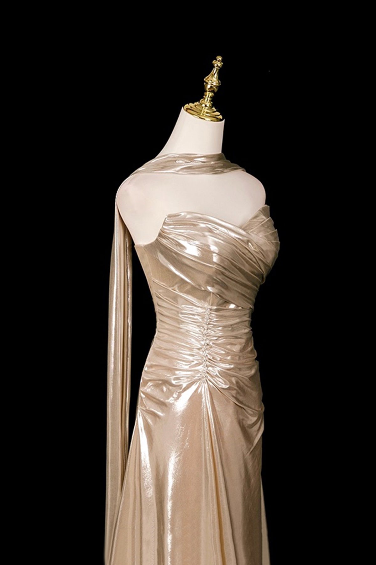 Champagne Sweep Train Floor Length Prom Dress, Champagne Mermaid Strapless Evening Party Dress