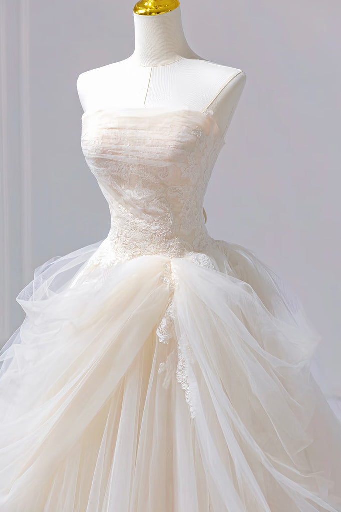 Ivory Tulle Lace Long Prom Gown, A-Line Strapless Formal Evening Gown