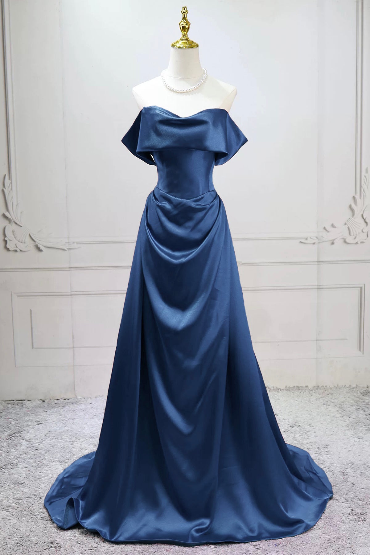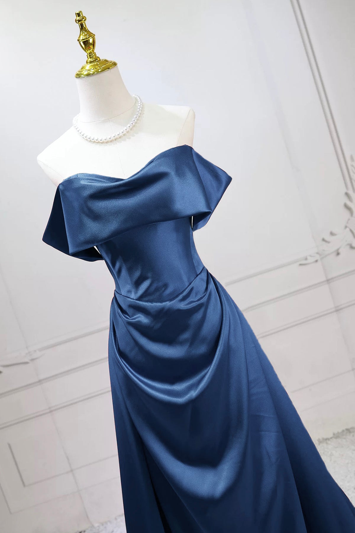 Elegant Navy Blue Off-the-Shoulder Satin Prom Gown with Ruched Bodice