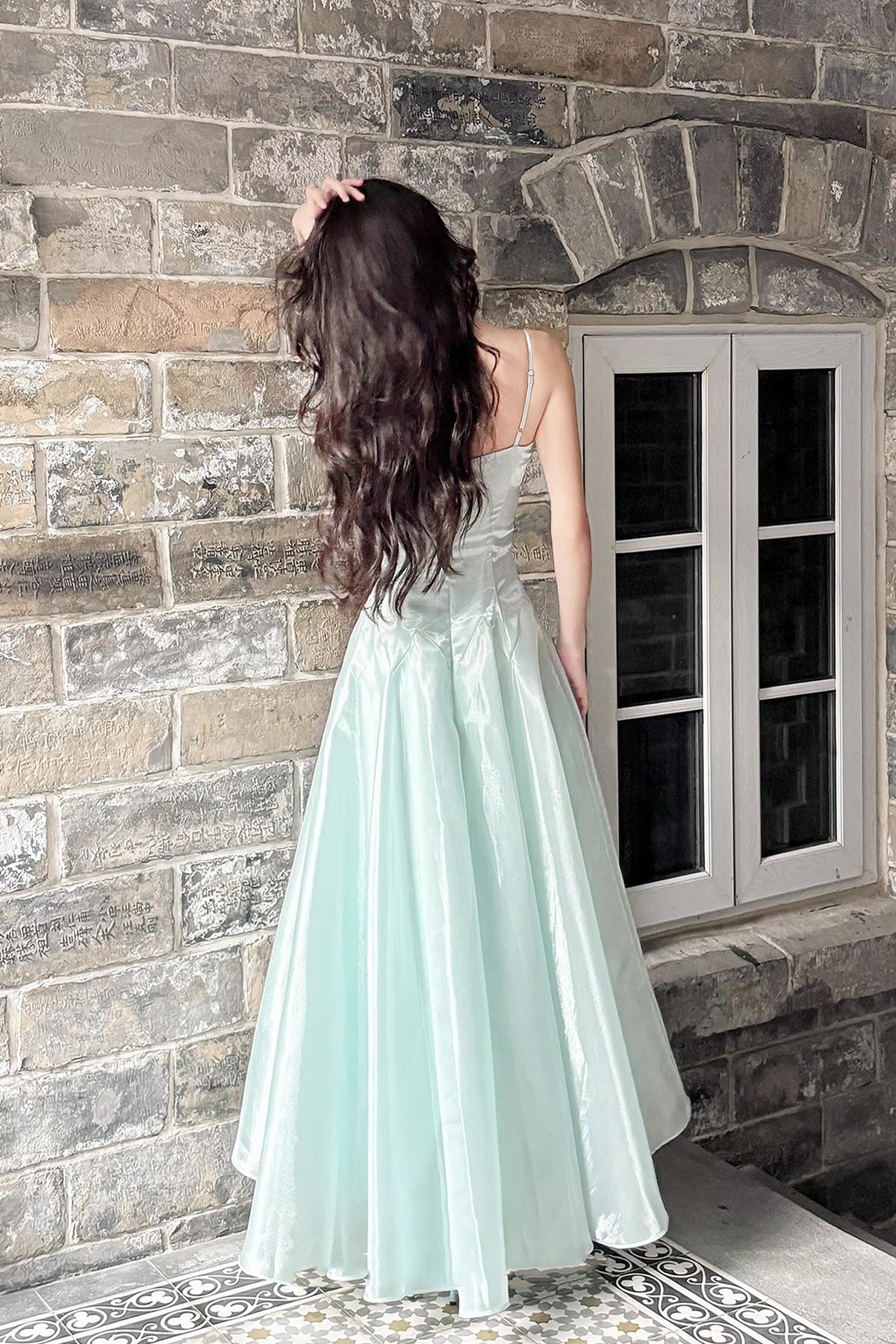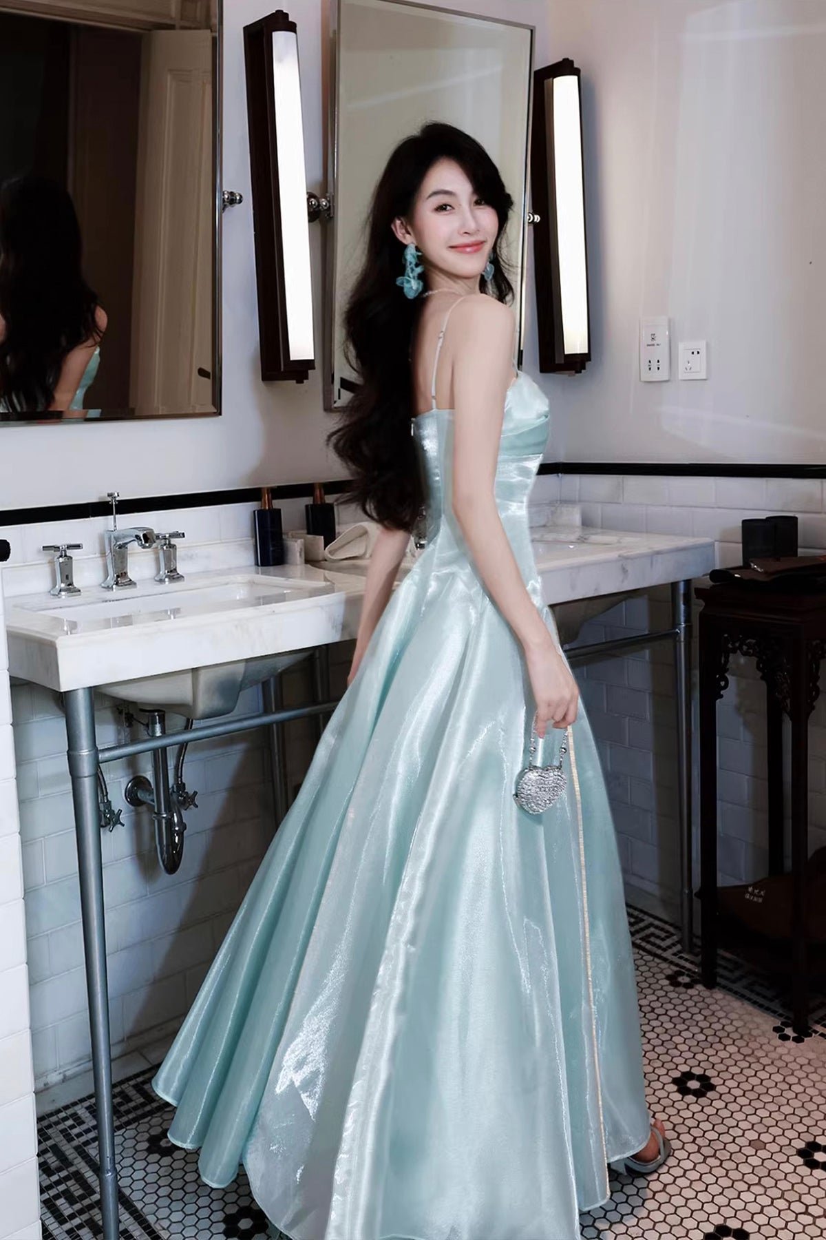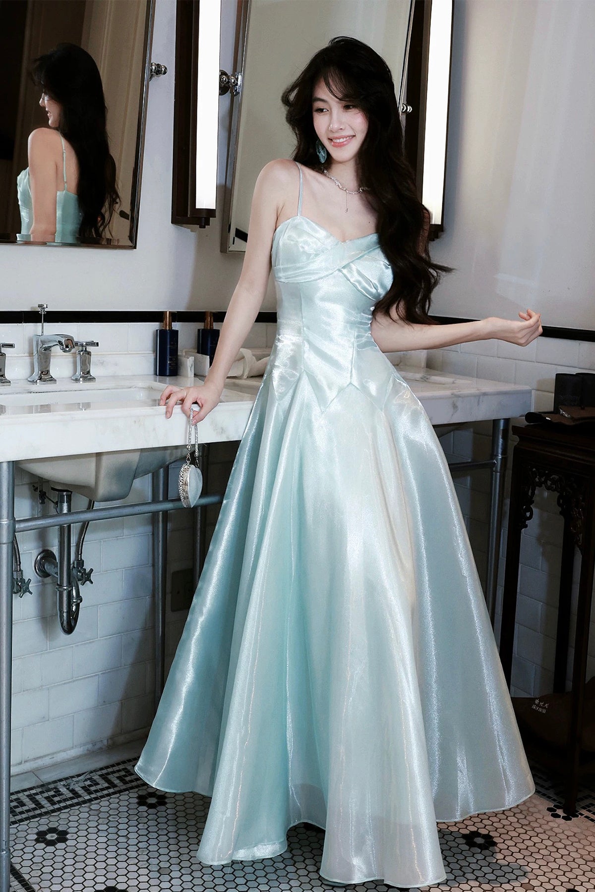 Elegant Light Blue Satin Spaghetti Strap Prom Dress with A-Line Skirt