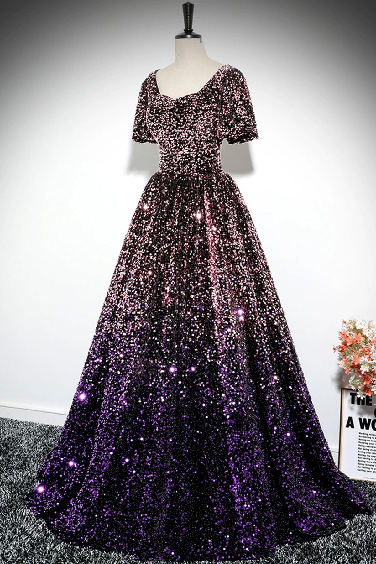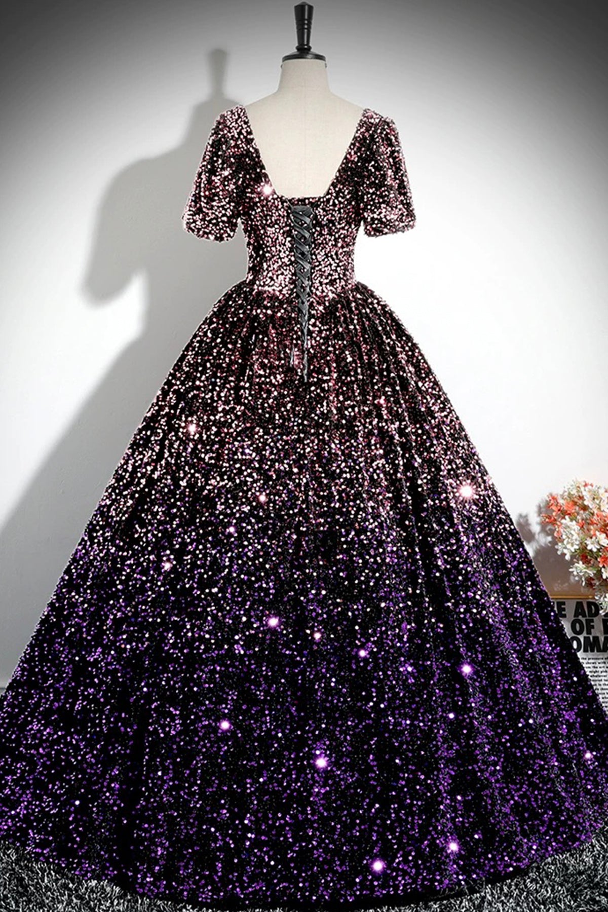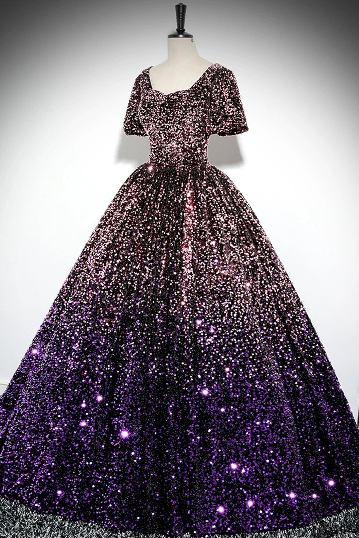 Pink Purple Ombre Sequin Ball Gown with Puff Sleeves, Sparkly Floor-Length Prom Dress