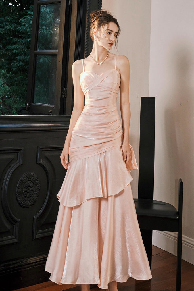 Blush Pink Satin Spaghetti Strap Evening Dress Ruffled Mermaid Formal Gown