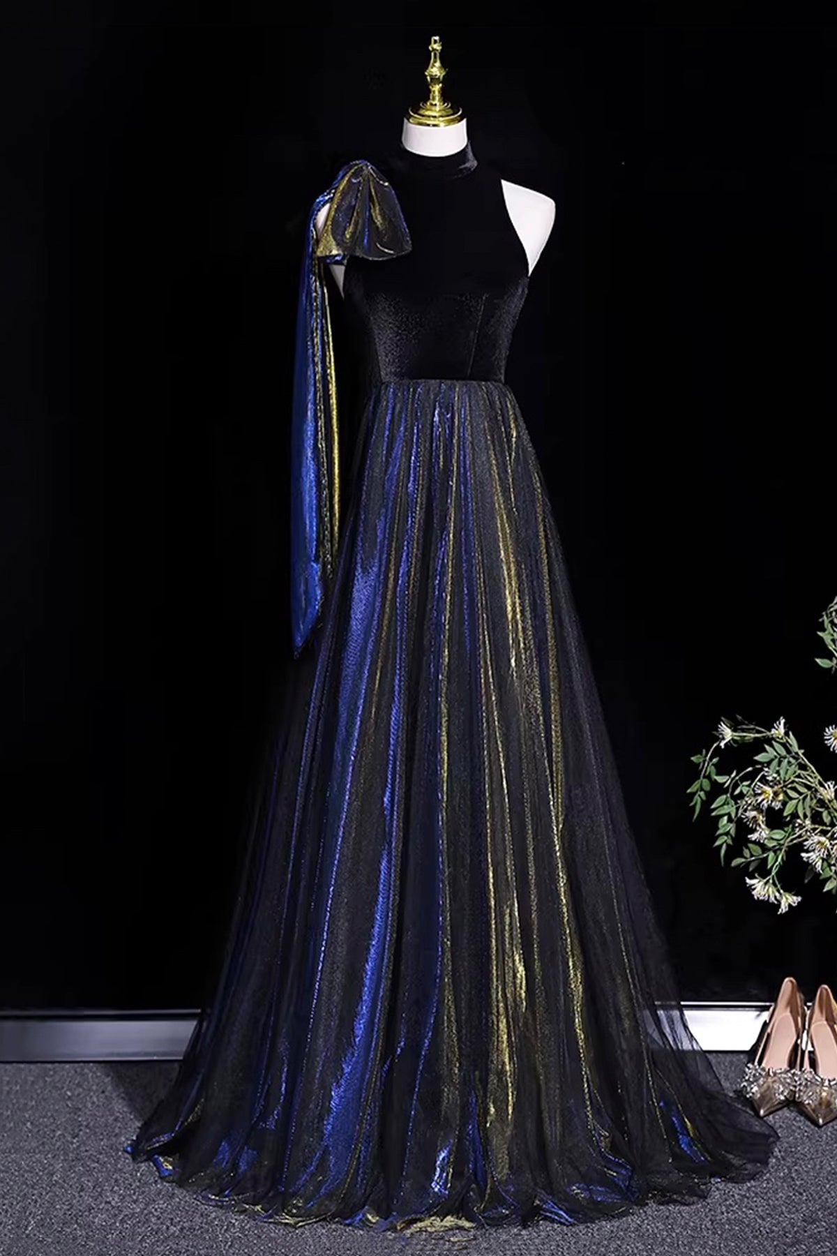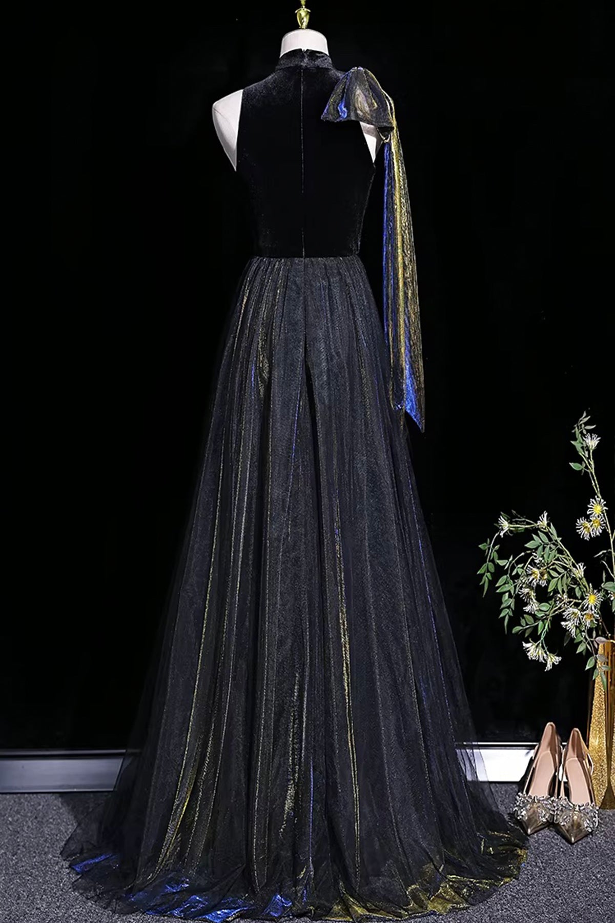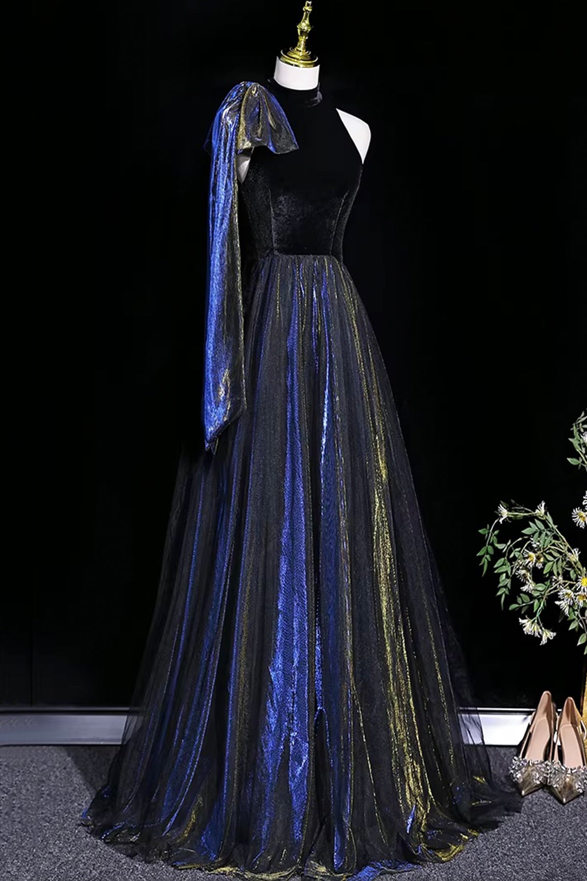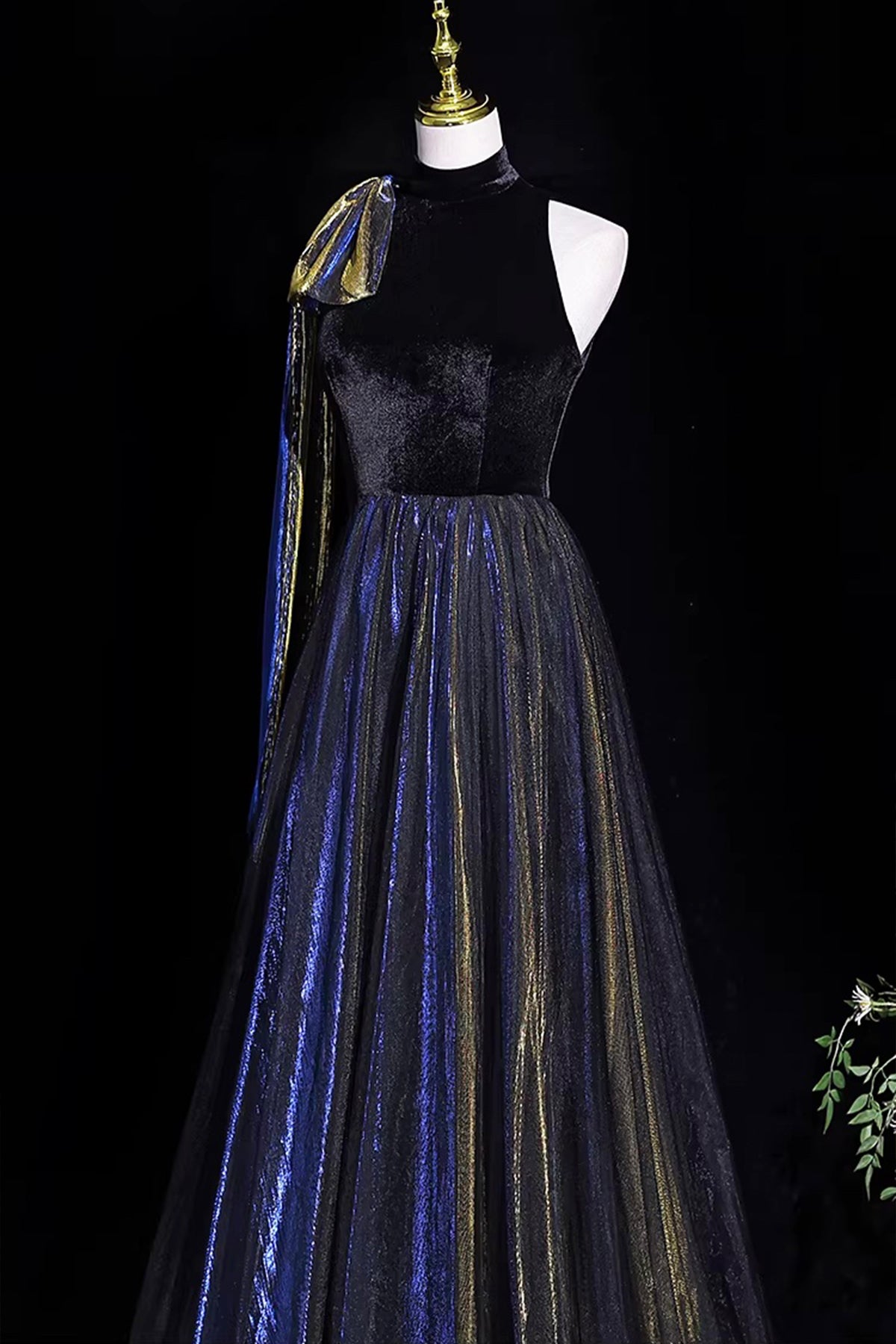 Luxury Black Blue Velvet Evening Gown with Gold Shimmer for Formal Events