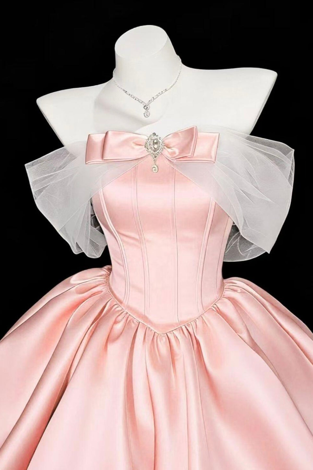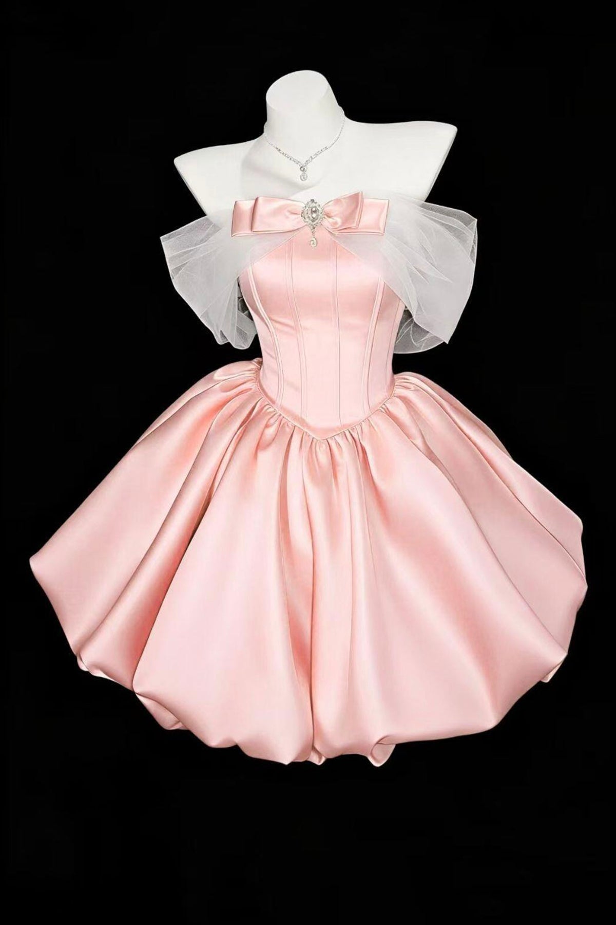 Pink Off Shoulder Satin Mini Prom Dress - Princess Party Gown