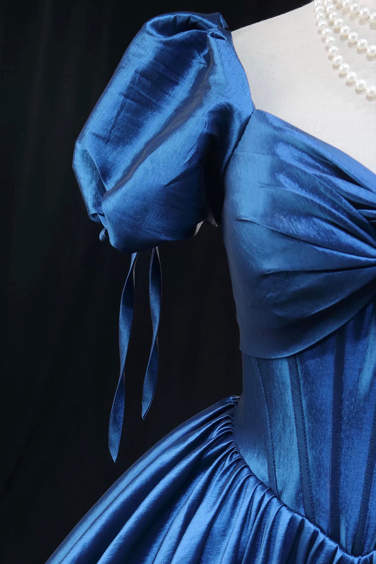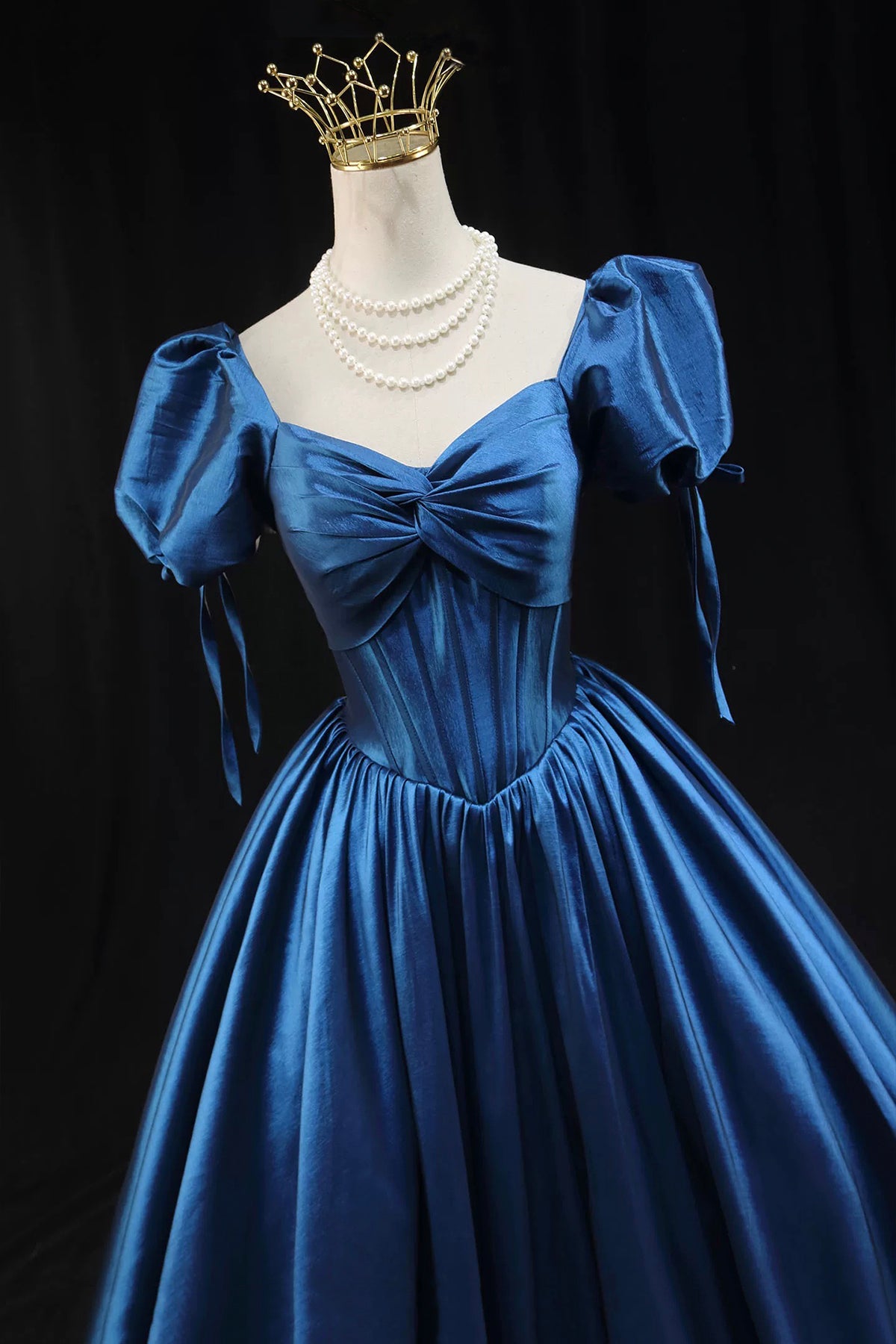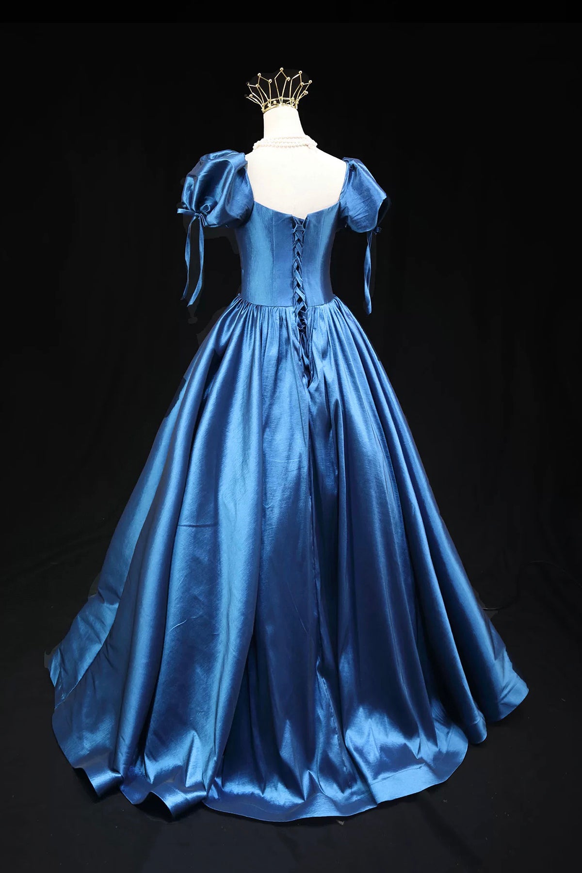 Blue Satin Ball Gown with Puff Sleeves, Princess Floor Length Prom Gown