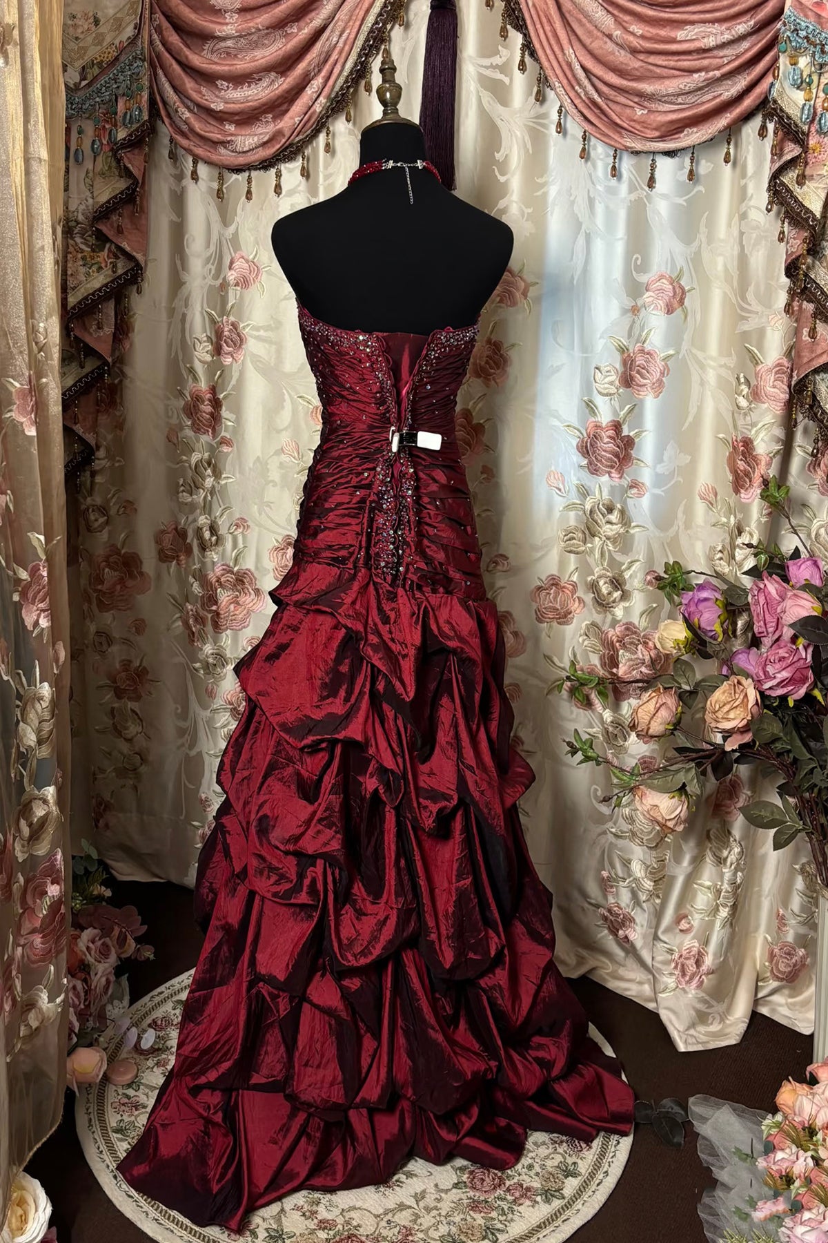 Burgundy Strapless Mermaid Prom Dress Taffeta Beaded Ruffle Formal Evening Gown