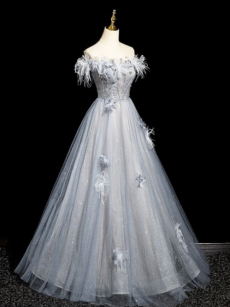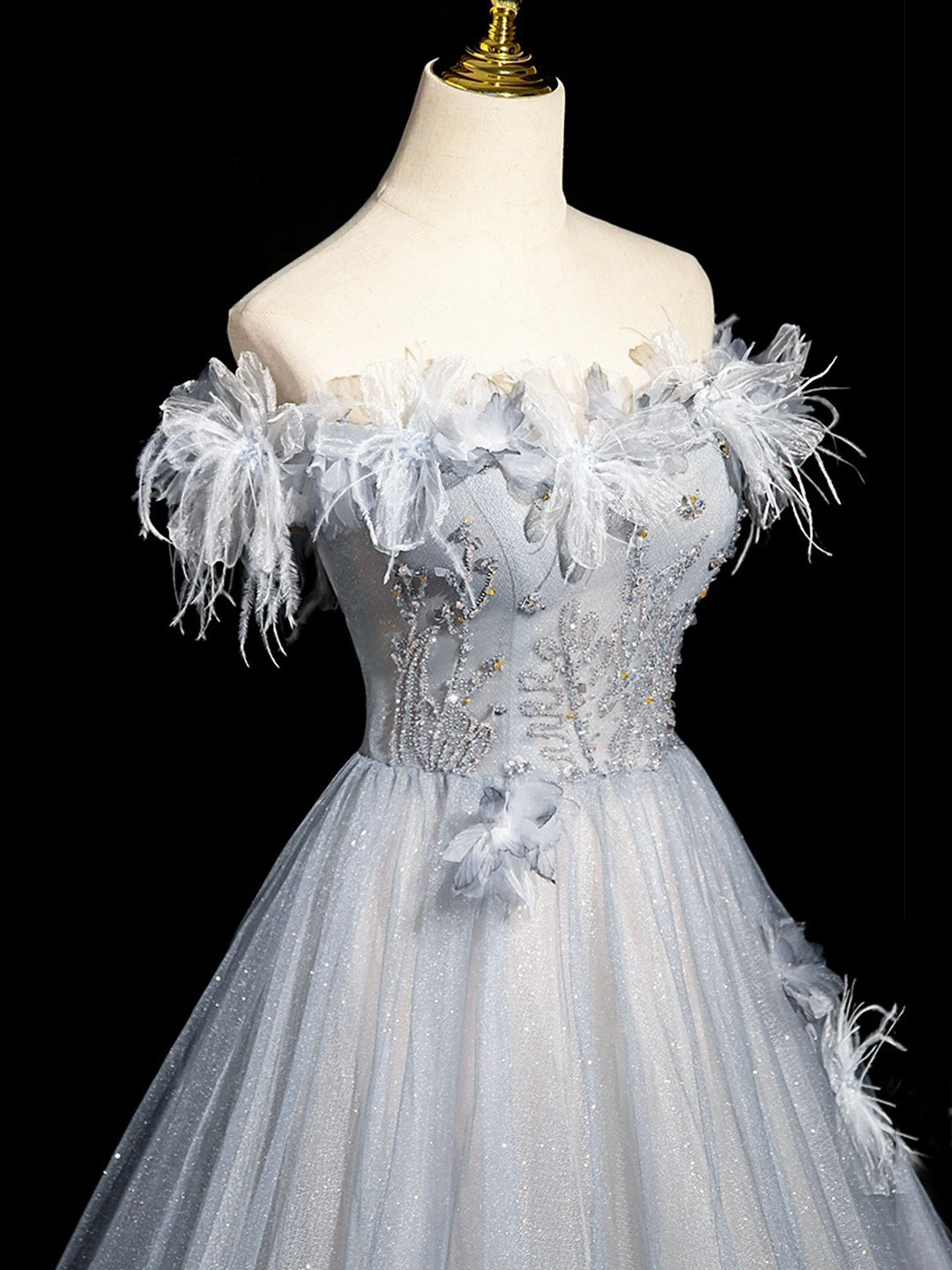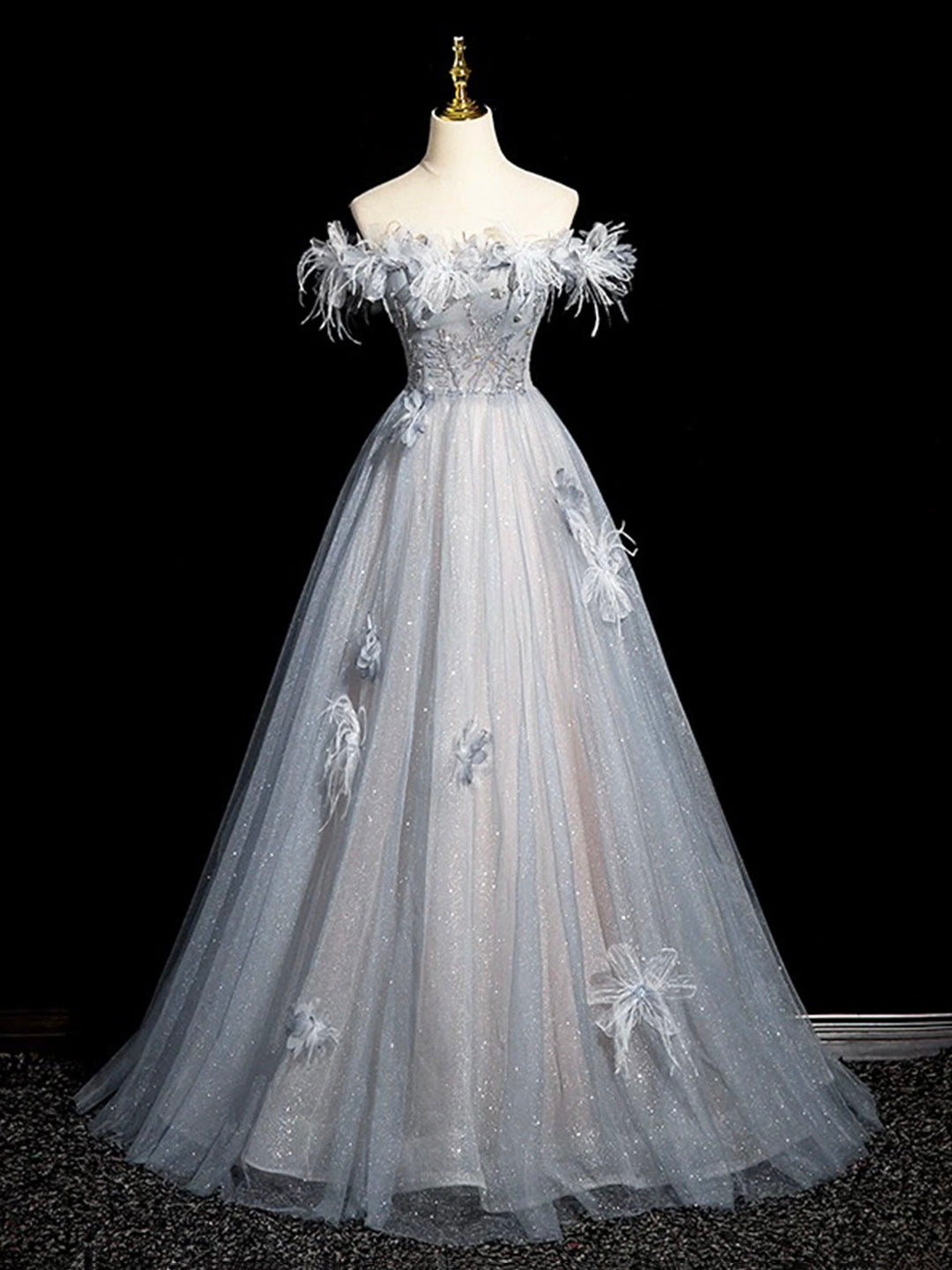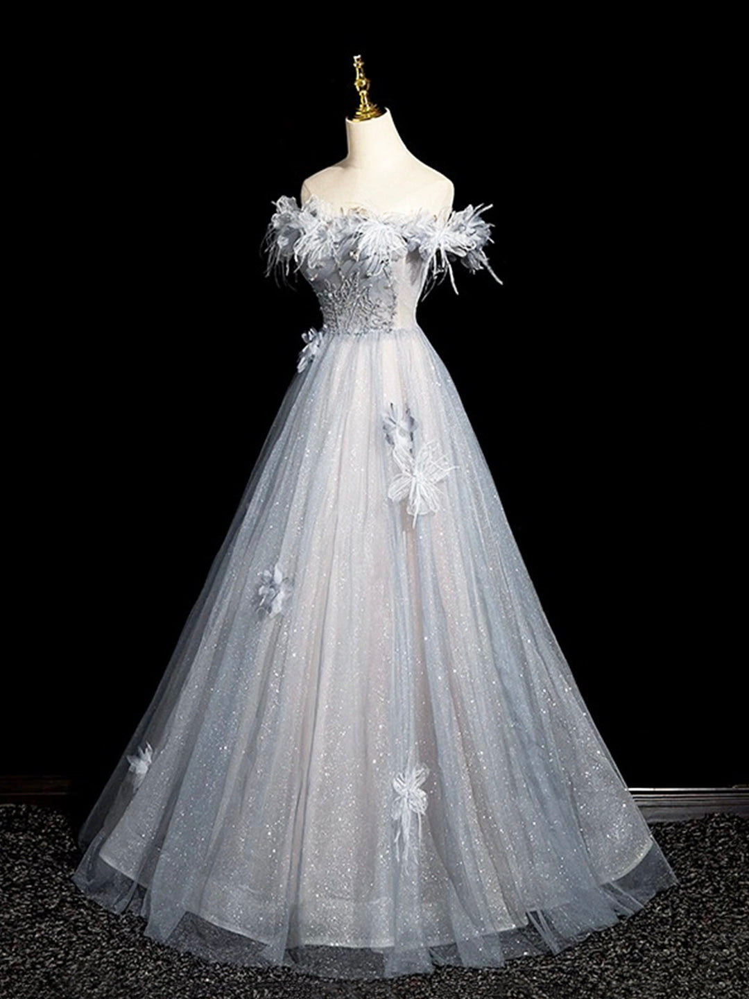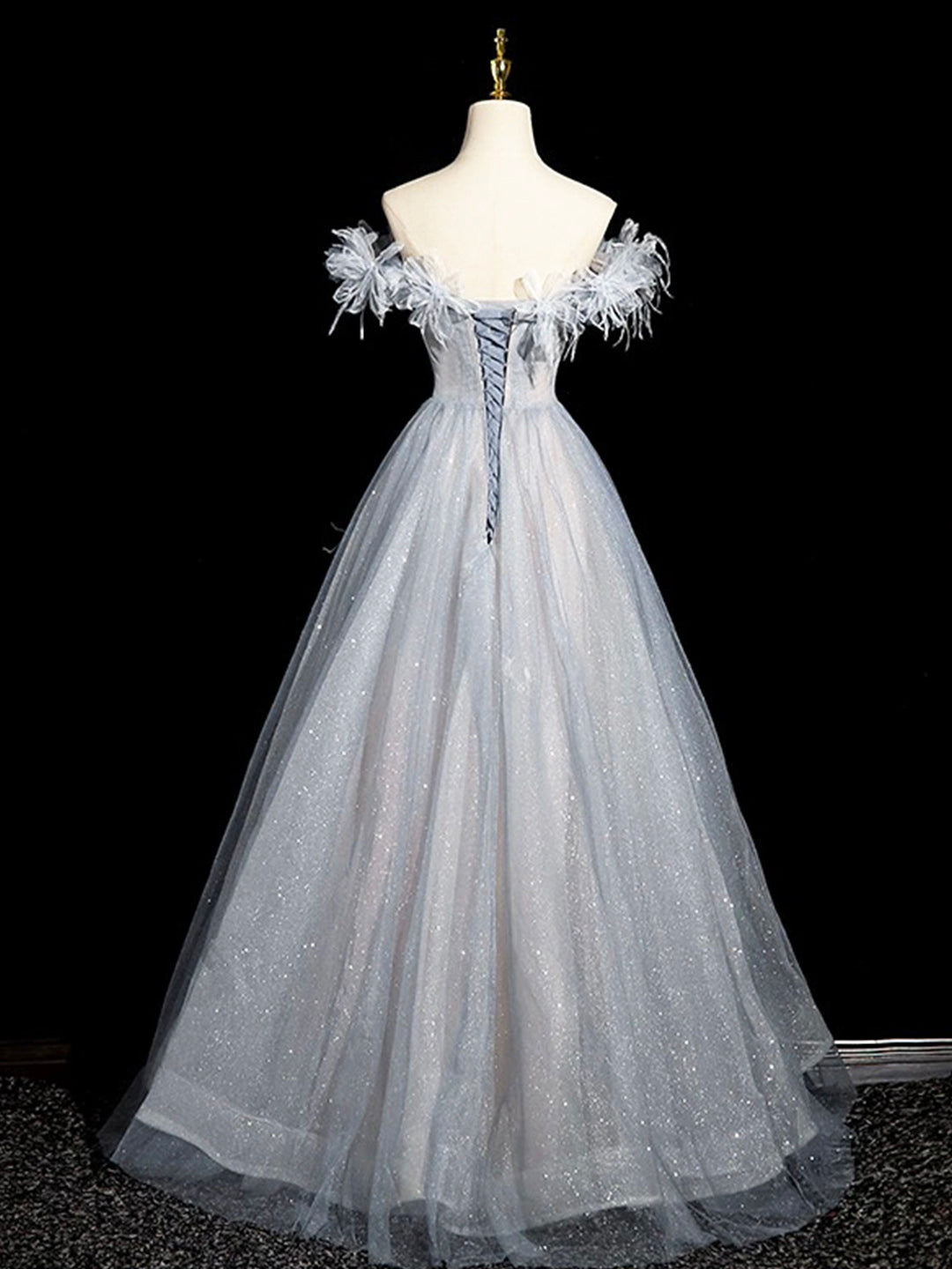 High quality Tulle Sequins Long Prom Dress, Shiny Gray Blue Off the Shoulder Evening Party Dress