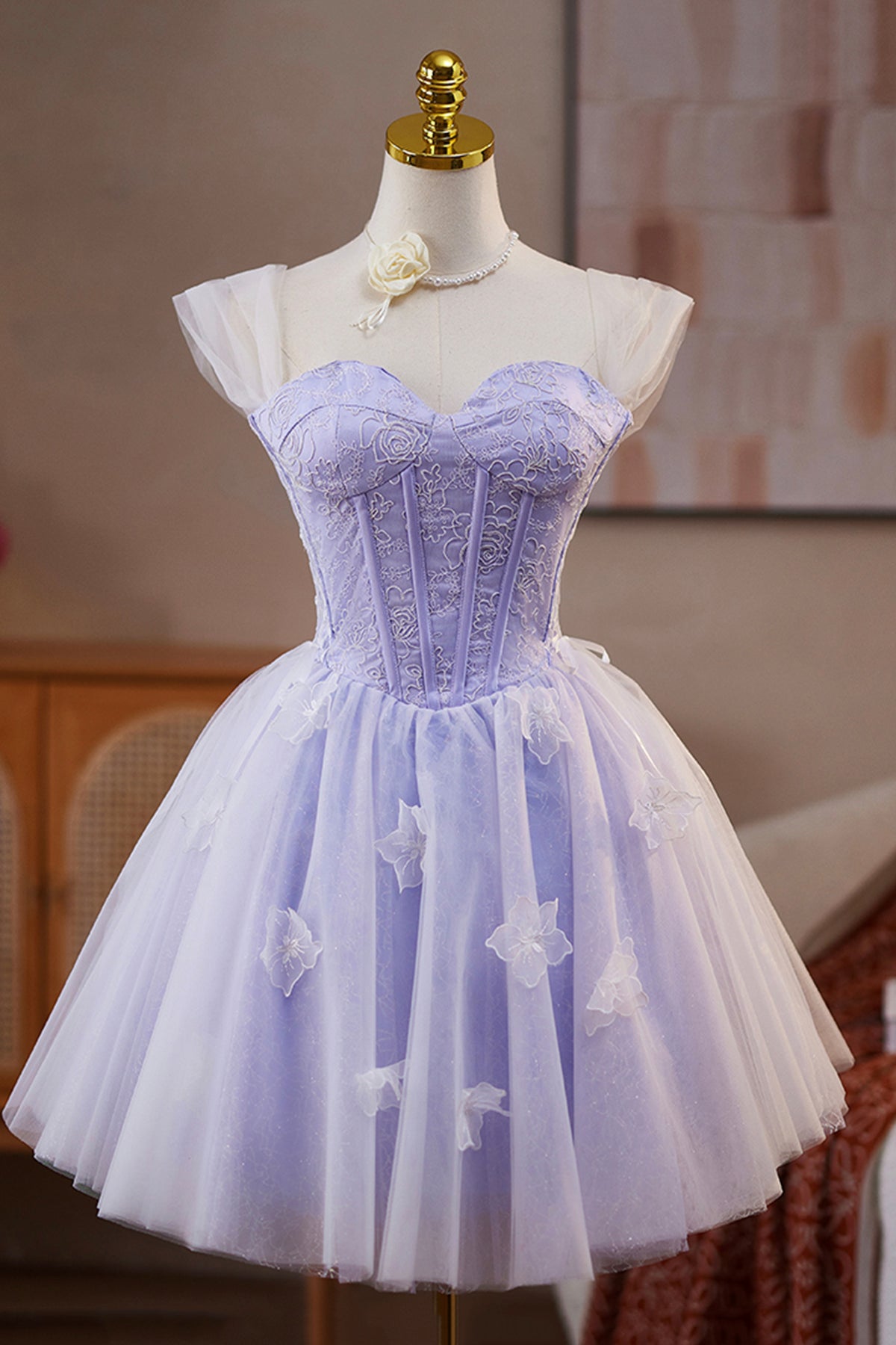Lilac Lace Off the Shoulder Short Prom Dress, A-Line Birthday Party Dress
