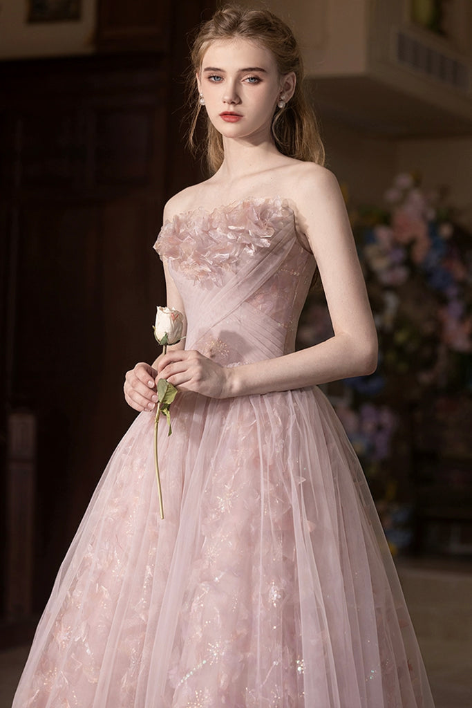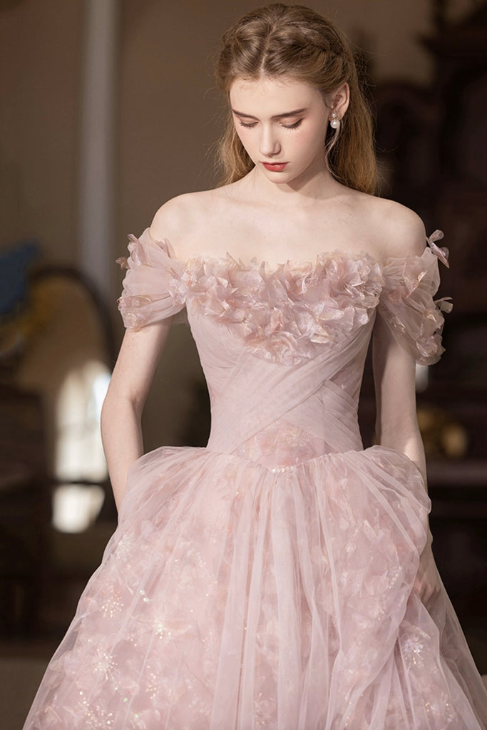 Pink Tulle Long Prom Dress, Beautiful A-Line Off the Shoulder Party Dress