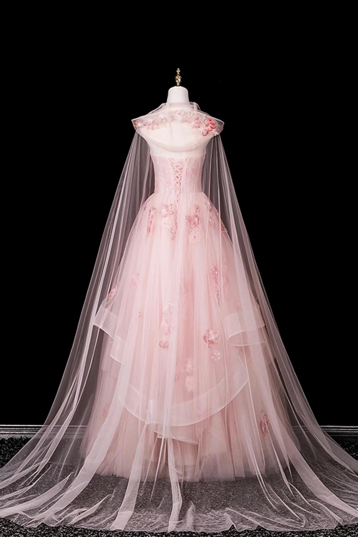 Sweetheart Neck Pink 3D Floral Applique Layered Tulle Ball Gown with Hooded Veil